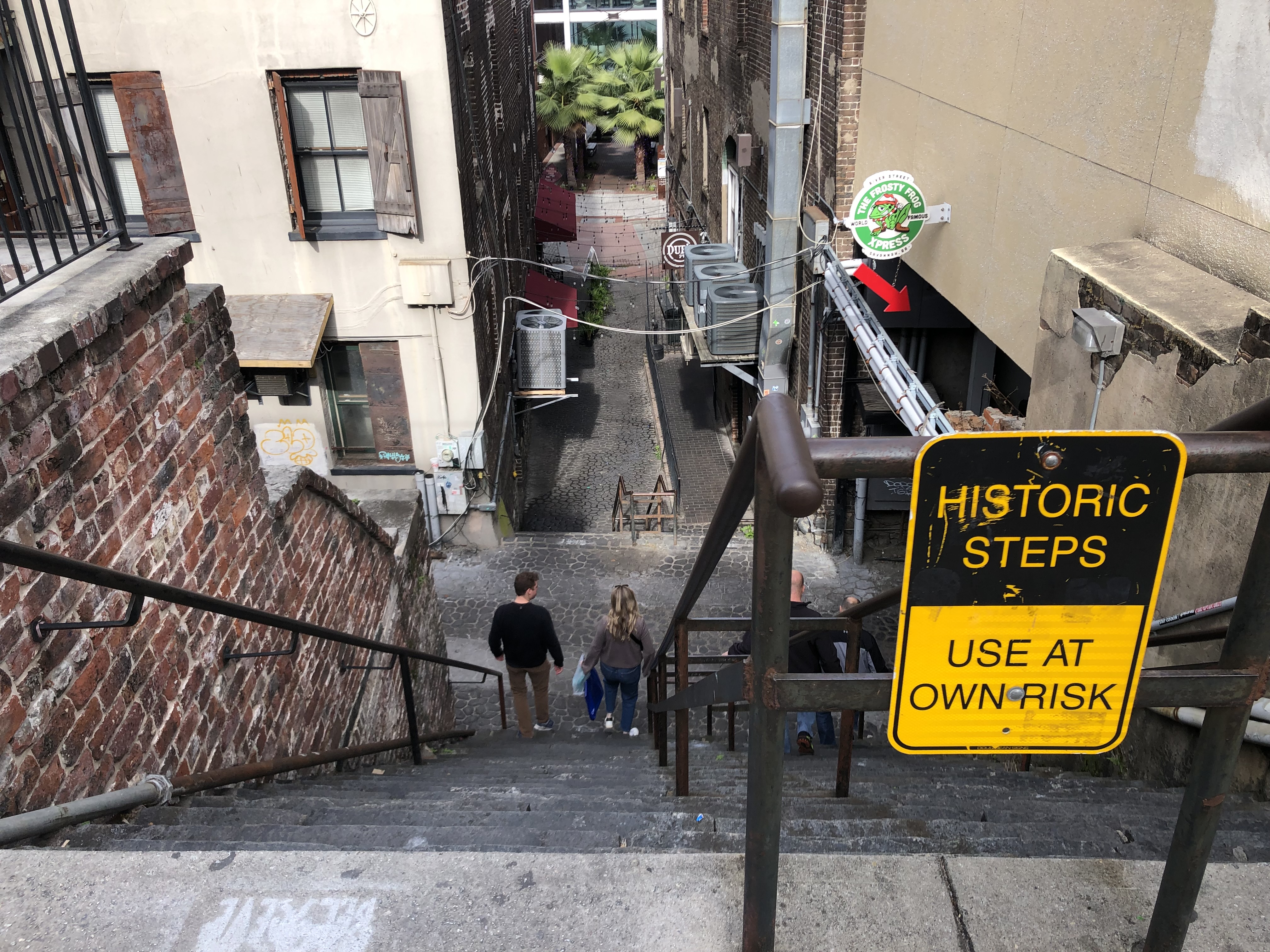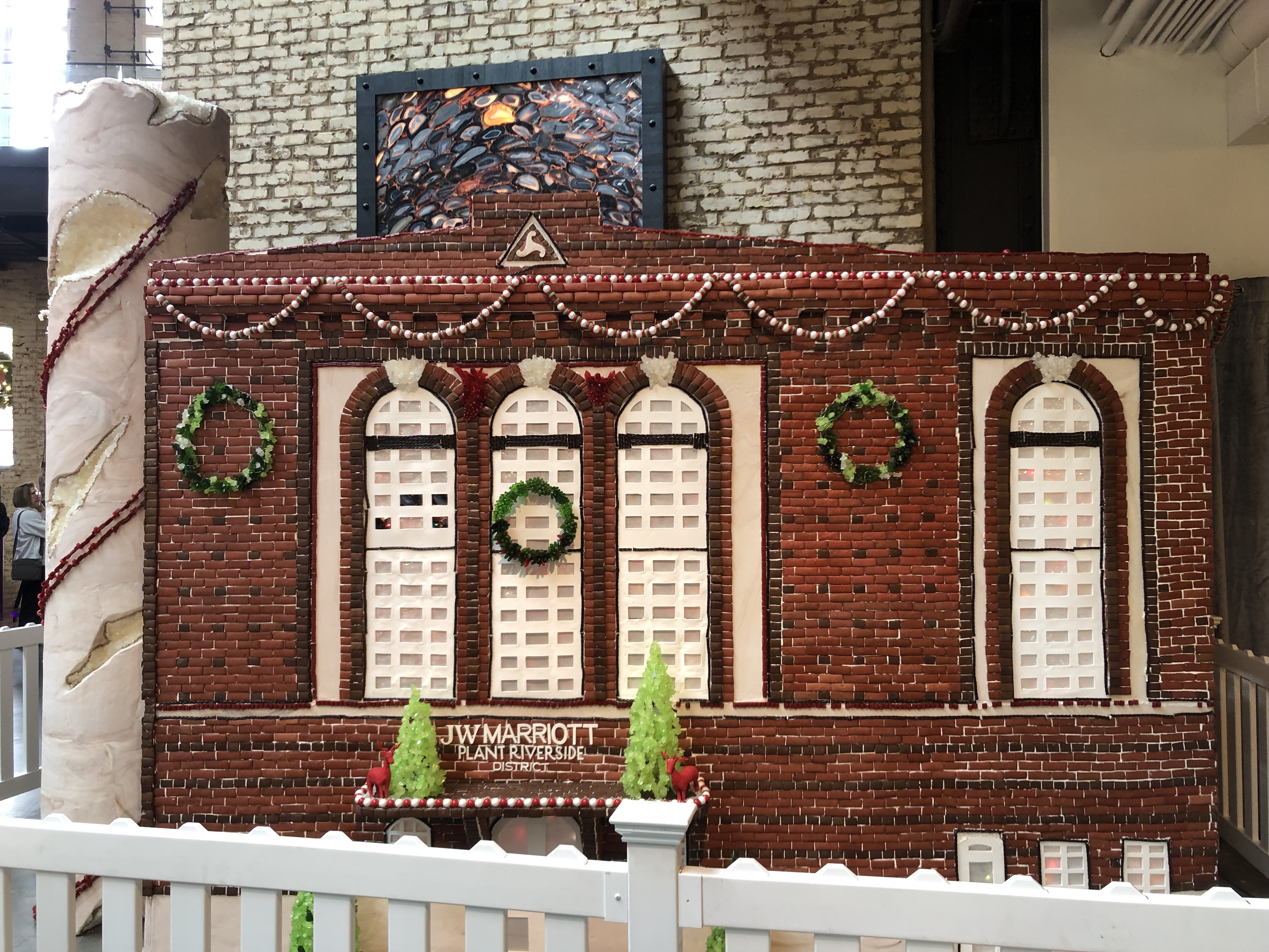 It’s not every day you see a chrome dinosaur. One of the gemstones is at the bottom of the frame.Since it was the Christmas season, there was a large, very impressive gingerbread house on exhibitThere was also a holiday market display along the riverwalk.I love the old steps that take you down to the river, but you definitely have to walk VERY carefully.