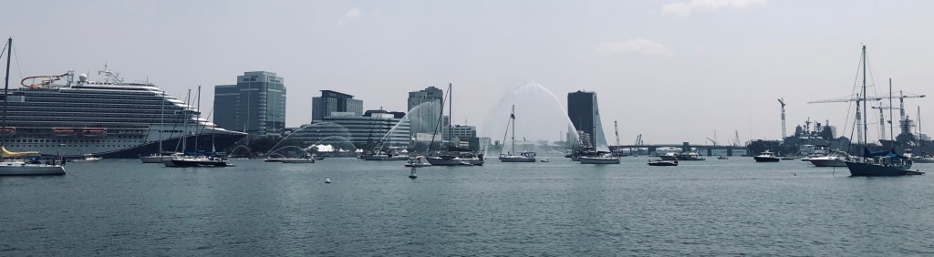 However, making lemonade out of lemons (as we try to do), we discovered that the last day we would be waiting in Norfolk was also the first day of the annual Harborfest. This is the United States’ largest, longest-running, free maritime festival, and we were psyched that we’d have this entertainment right off our cockpit while we were anchored.