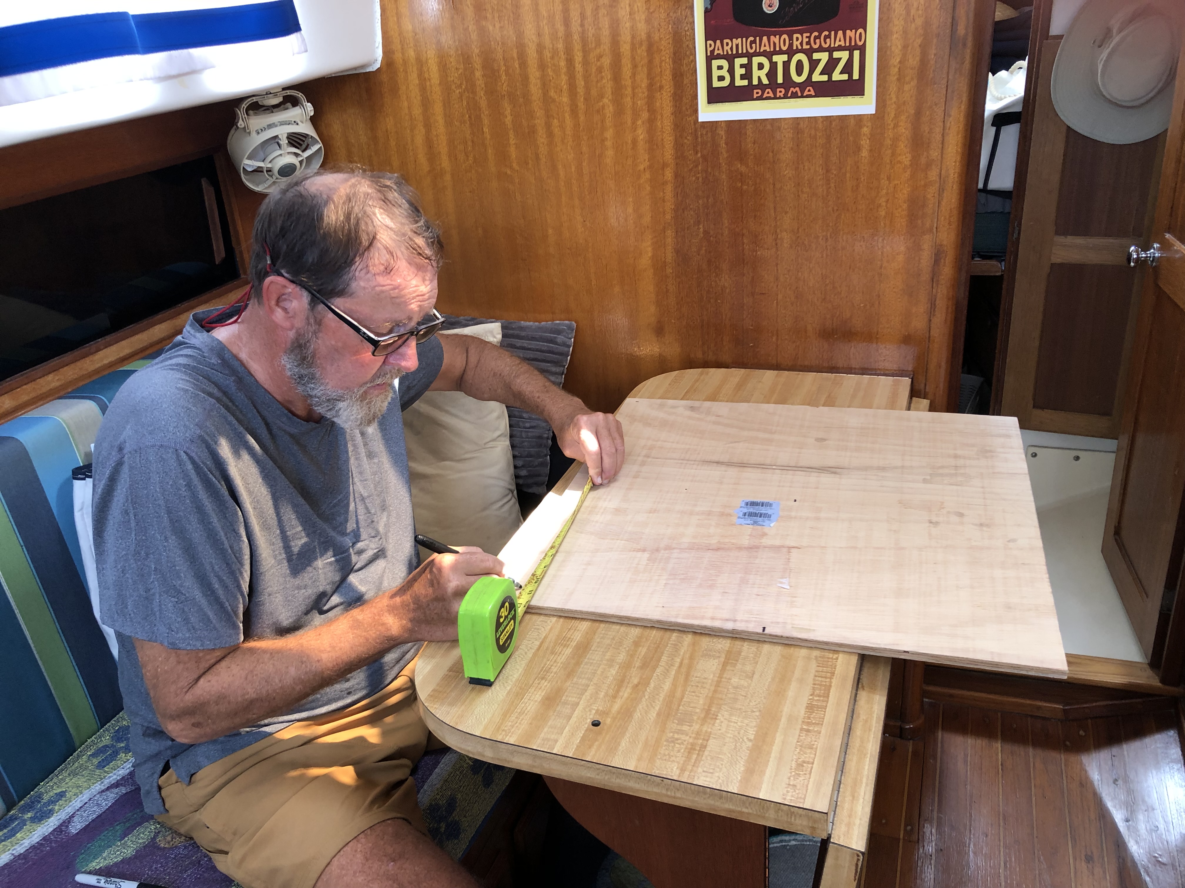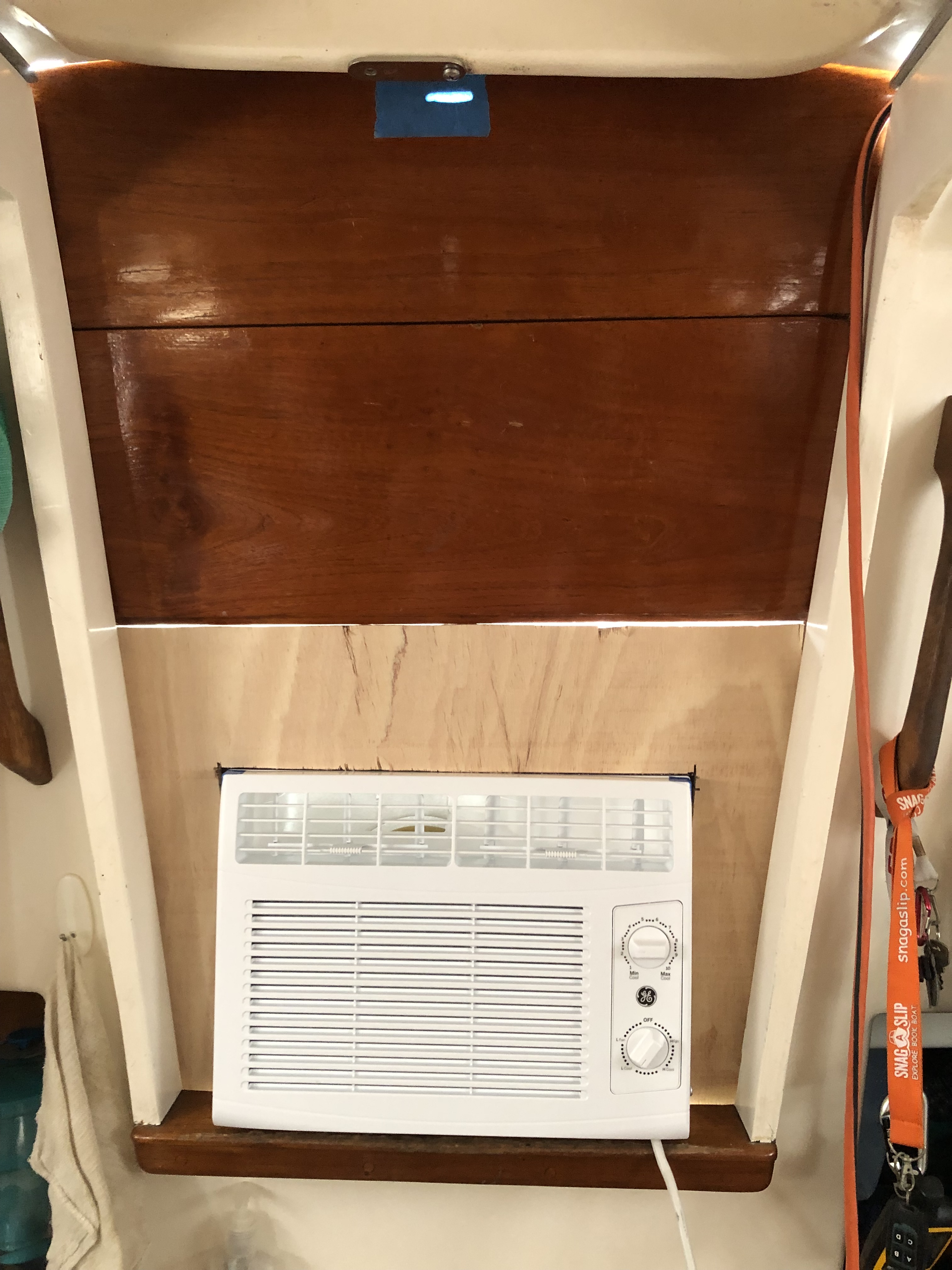 The marina is very protected which basically means that an AC is mandatory once July rolls around, so we bought a small window unit and Jeff made a frame out of plywood so we could install it in the companionway. Last time we installed it in the hatch and didn’t really care for that location. Fortunately, the companionway worked out much better even though it’s a bit of a stretch for me to step over it.