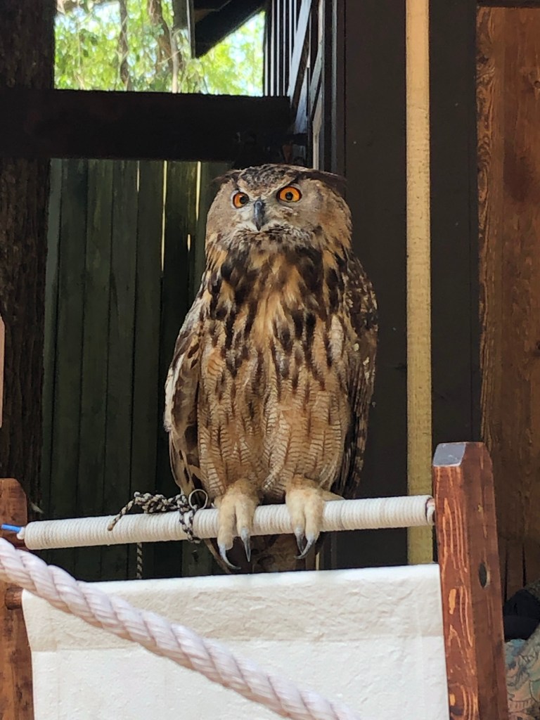 Jeff enjoying the traditional meat on a stick before we watched Paolo Garbanzo, an international jester and juggler extraordinaire. Ballerina fight! Ballerina fight! Architecture fight! Architecture fight! (You had to be there.)The King and Queen of Revel Grove.Jeff loves birds of prey, so the falconry show was a must-see.My sister loves owls, so of course I had to take this picture.