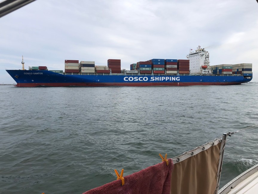 It was on the James River when we were heading towards Norfolk that Jeff W learned why we suggested multiple times that he close the hatches while he is underway. I definitely bear some responsibility. A cargo ship was crossing our bow and I didn’t alter our course enough to avoid crashing into his wake.