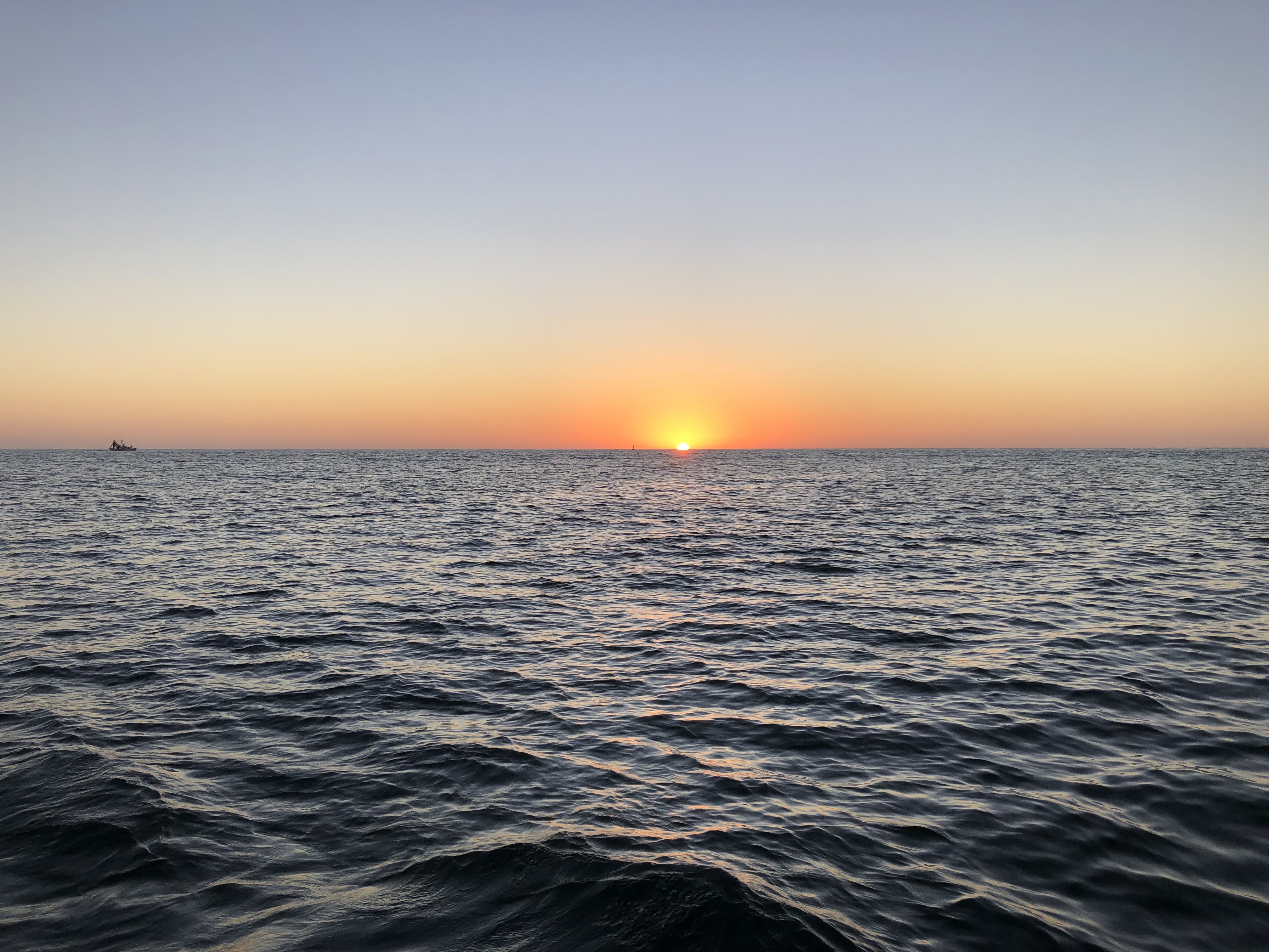 A beautiful sunrise as we left the Little River inlet.The water color was beautiful for this outside leg, reminding us somewhat of the Bahamas.Heading to our anchorage in Winyah Bay. You can see how flat the water is. The conditions were SO smooth.