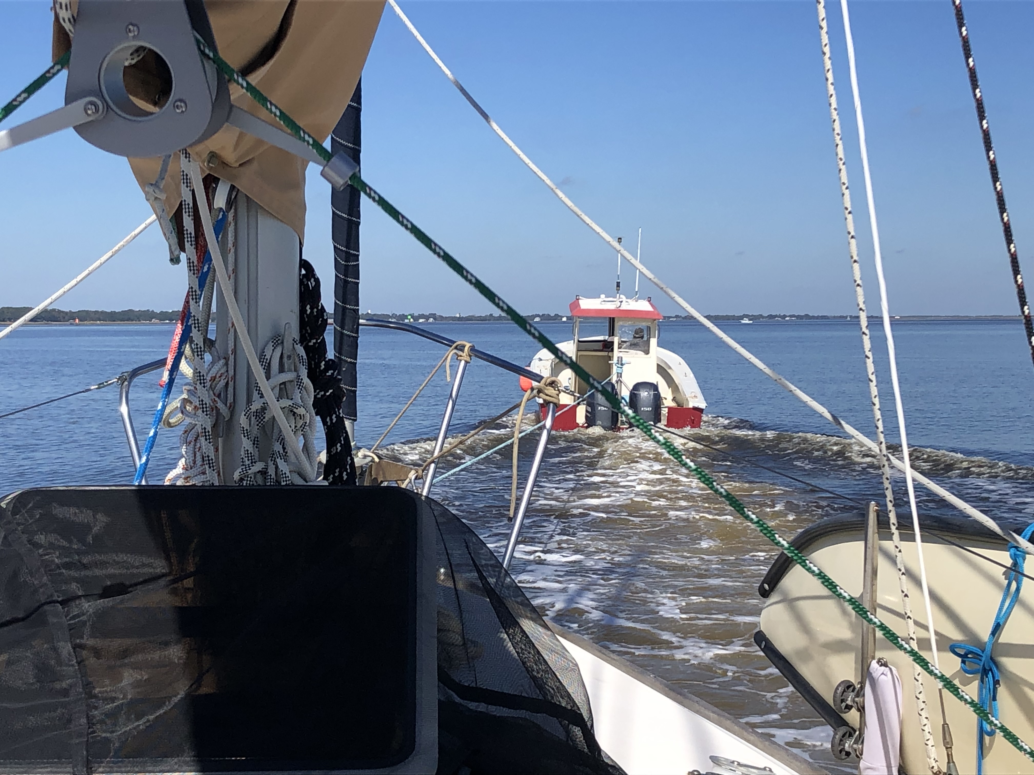 Finally it was time to reluctantly leave and head towards Isle of Hope to get the engine replaced. Once again, the weather gods were smiling on us. All week in Beaufort there either hadn’t been wind or it was in the wrong direction. But on departure day we had good wind for an easy sail to our anchorage at Bull Creek.