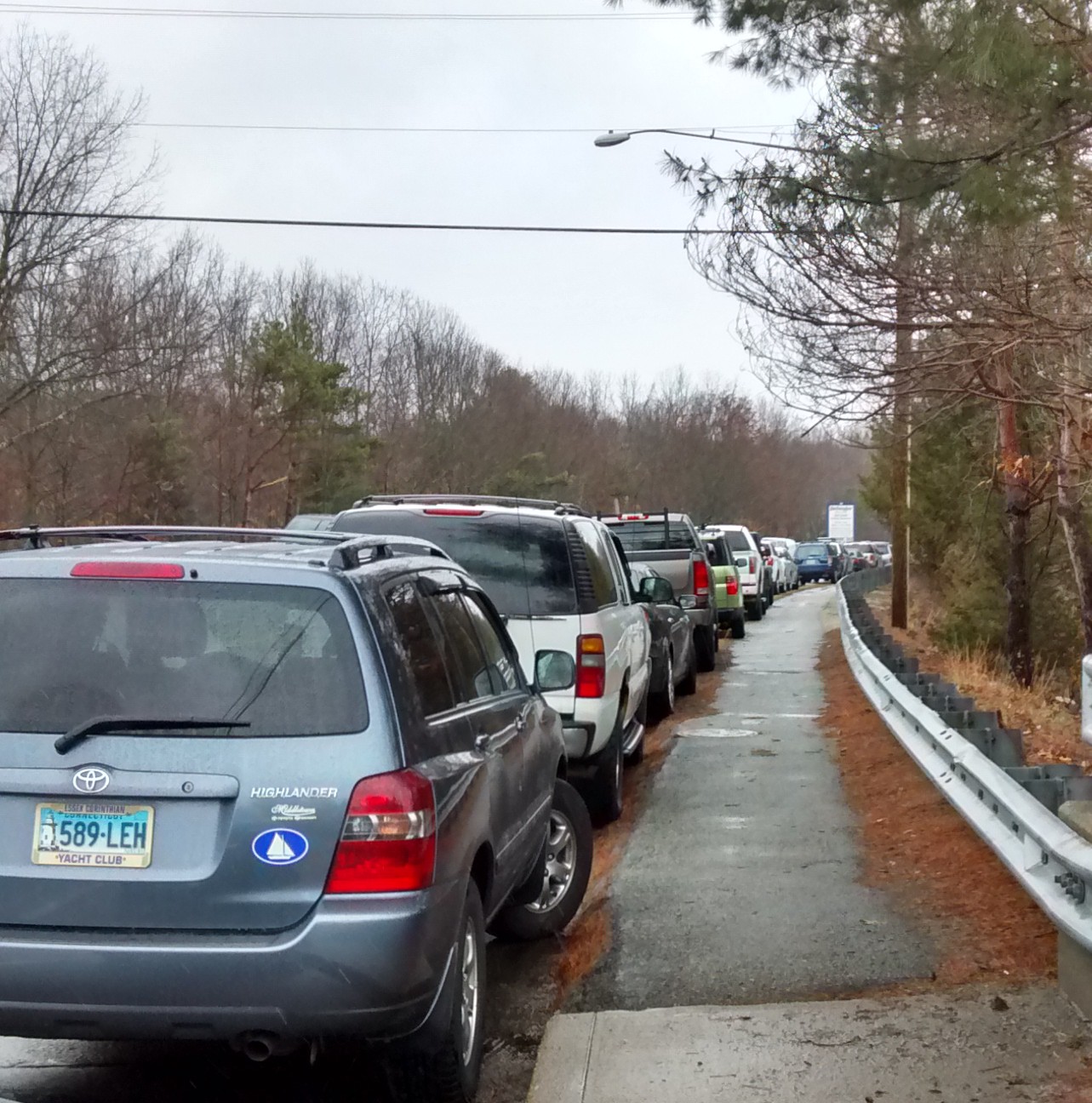 The white sign at the far end marks the entrance to the long driveway. Cars were parked all along the road and the driveway and the parking lots were jammed.