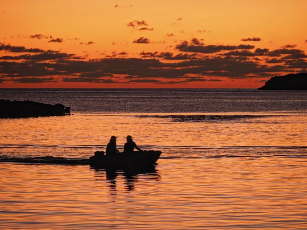 Finally, although we didn’t get a chance to get together for sundowners with them, we were also able to see and chat with our friends Chuck and Helene on Aurora. Their trip to the Bahamas was a bit shorter so our paths never did cross again for those sundowners, but hopefully we’ll see them again this summer. In the meantime, Chuck snapped this fantastic shot of Jeff and I are in our dinghy as the sun went down one evening. Thanks again, Chuck!